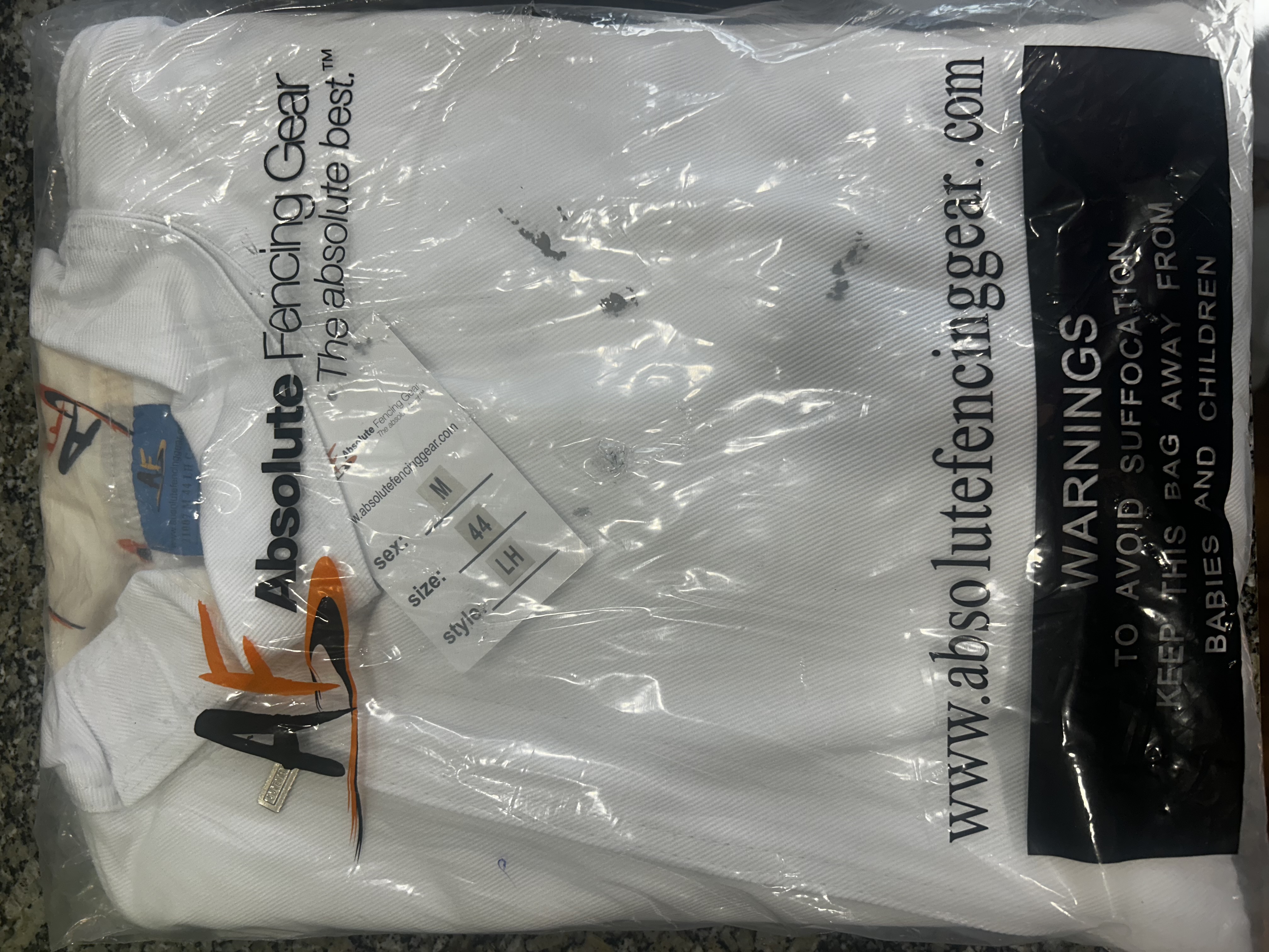 White men’s absolute fencing, gear left-handed jacket, size 44. New in package never opened.